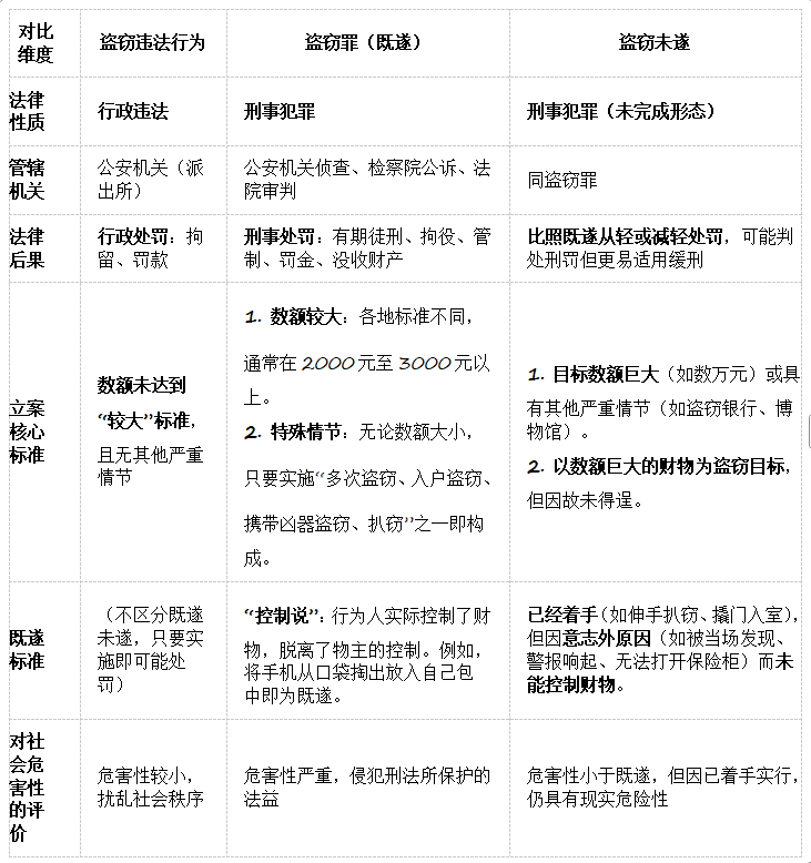 对比维度 盗窃违法行为 盗窃罪(既遂) 盗窃未遂