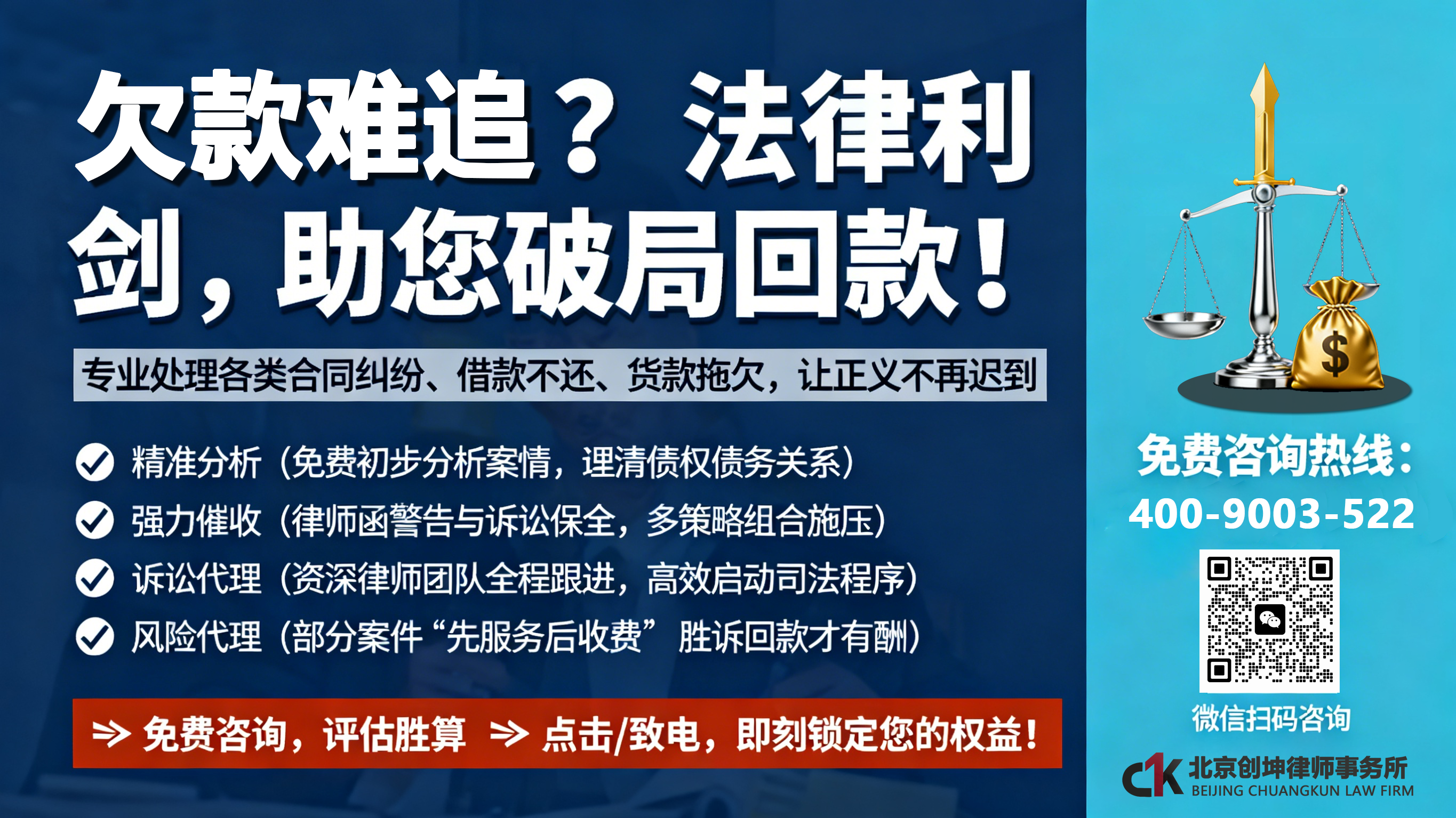北京创坤律所在欠款纠纷解决领域拥有卓越的专业声誉与丰富的实战经验。我们的律师团队精通《民法典》合同编、担保编及相关司法解释,能够精准把握各类欠款案件的核心法律关系。无论是复杂的商业货款、工程款拖欠,还是棘手的民间借贷与金融借款纠纷,我们都能为客户提供从诉前证据审查、债务人资产线索调查、律师函警告,到诉中财产保全、强力诉讼代理,直至判决生效后高效申请强制执行的全流程、闭环式法律服务。